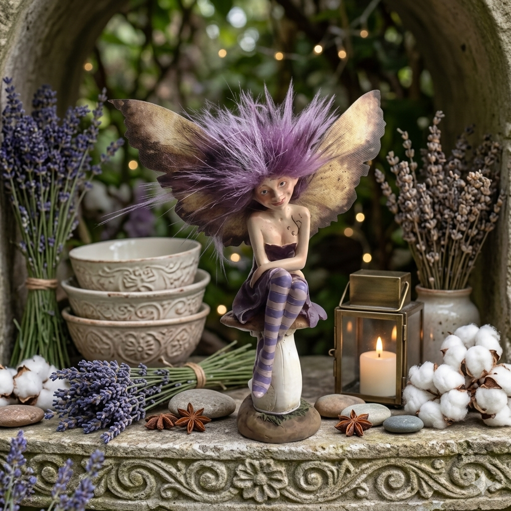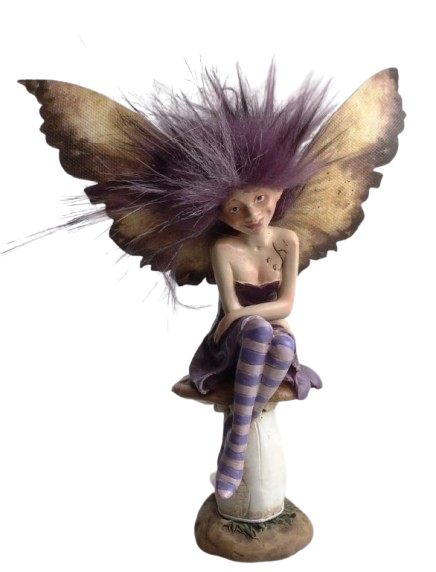 Denne siddende Fairy er kendetegnet ved sit dramatiske, buskede lilla hår og de store sommerfuglevinger med et unikt, plettet mønster. De lange, lilla og hvidstribede ben, der er dækket af stribede leggings, giver figuren et moderne og lidt finurligt touch. Paddehat-basen er i hvid med store, uregelmæssige lilla prikker, præcis som en klassisk fluesvamp.