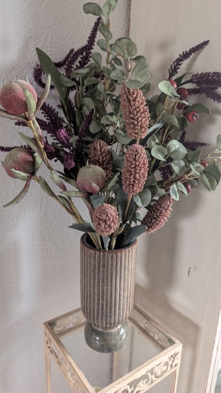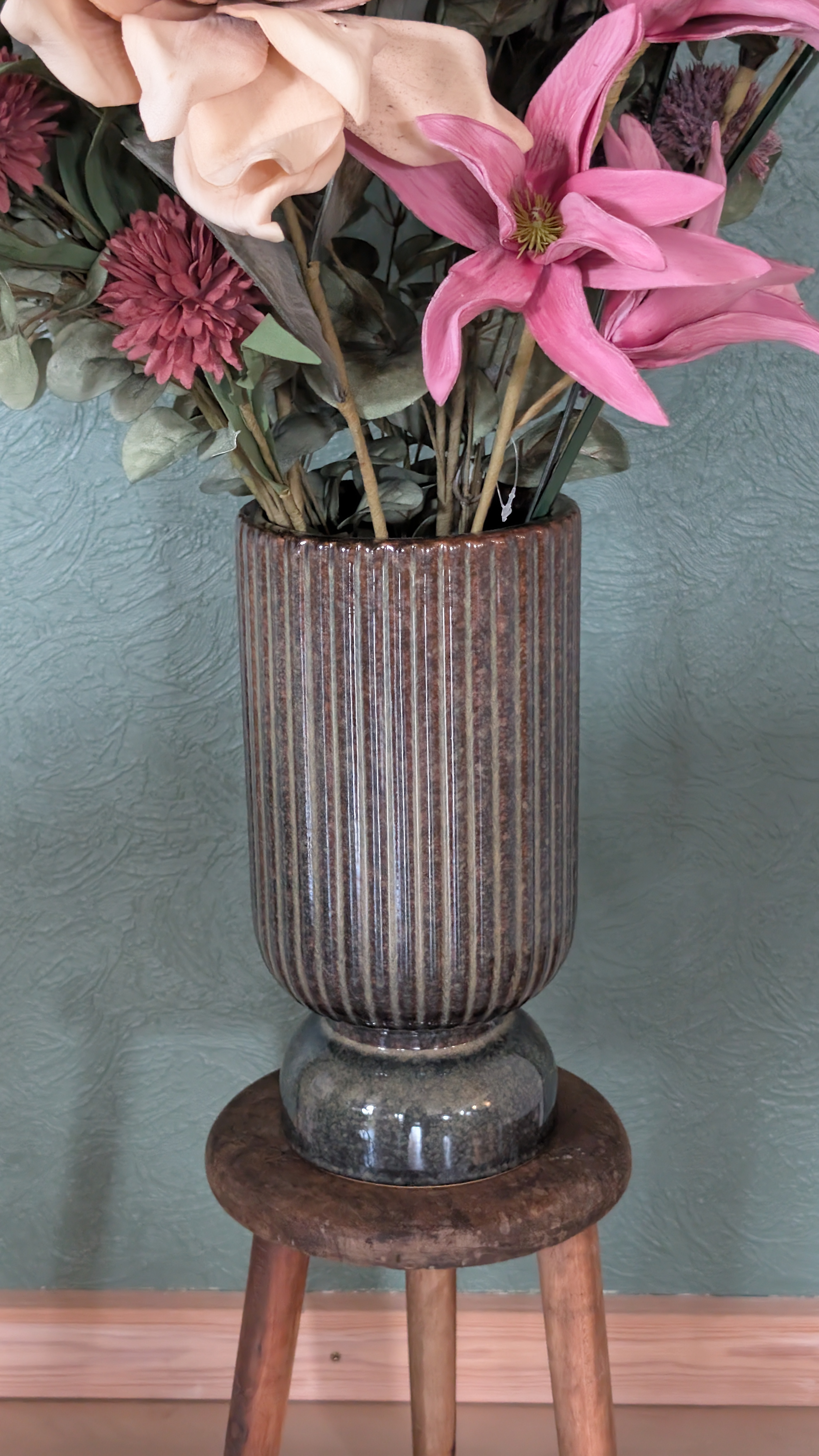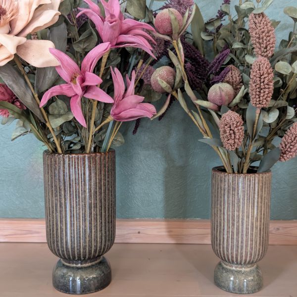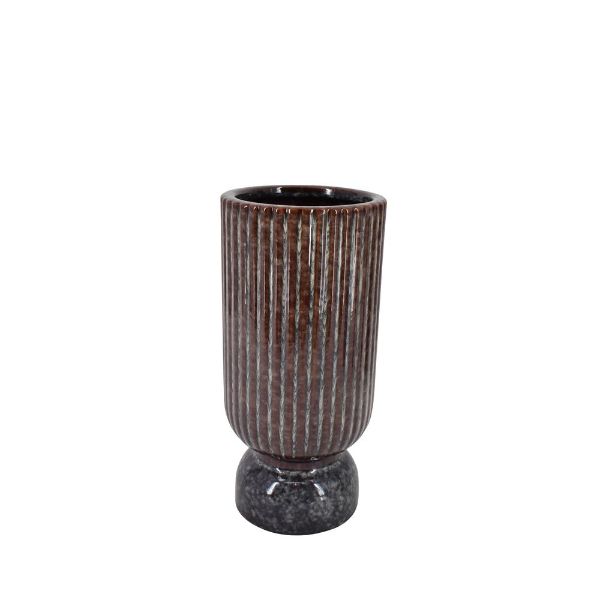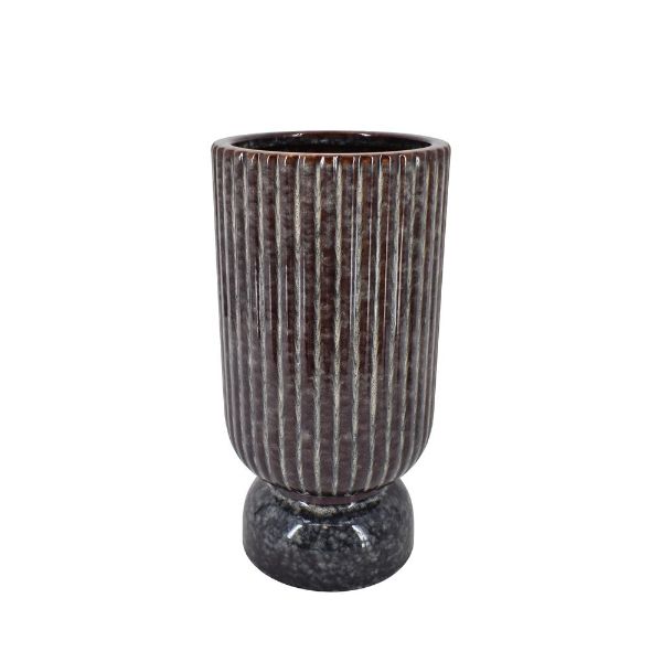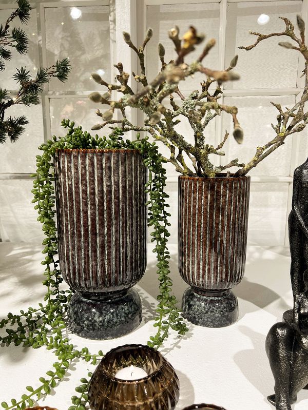 Tilføj varme og jordnære nuancer til din indretning med disse smukke keramikvaser, der sender en kærlig hilsen til 70'ernes populære retro-stil. Vaserne har en unik, mønstret overflade med vertikale riller, der giver et taktilt og moderne udtryk. Den dybe brune farve varierer smukt i nuancerne, hvilket fremhæver materialets naturlige karakter og skaber et organisk look, der passer perfekt ind i både det moderne nordiske hjem og i en mere nostalgisk indretning.