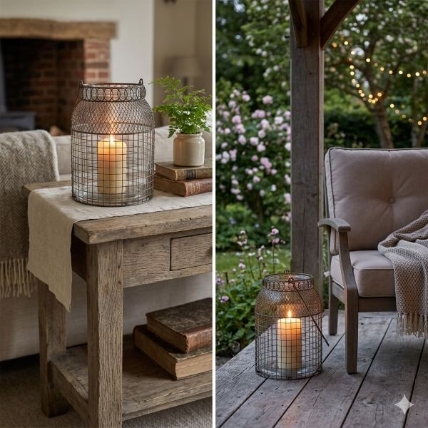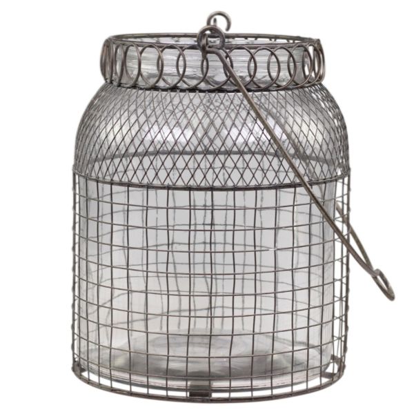 Giv dit hjem et strejf af industriel og rustik charme med denne smukke Fil de Fer lanterne. Lanternen er opbygget omkring en solid glaskrukke, der er omgivet af et udvendigt, patineret jerngitter i et råt "hønsetråds-look". Toppen er afsluttet med et dekorativt snoet metalbånd, og den har en praktisk hank, så den nemt kan flyttes rundt eller hænges op.