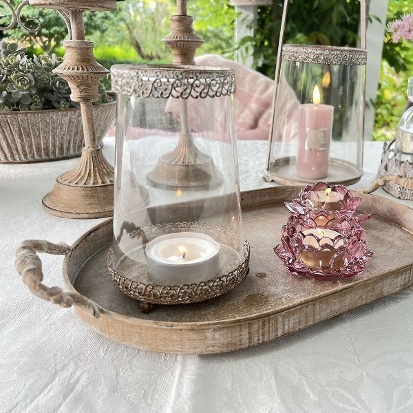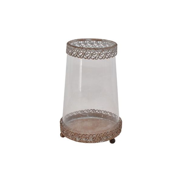 Skab en hyggelig og rustik atmosfære med denne smukke hurricane lysestage i en elegant antik sandfarve. Lysestagen er udført i en kombination af jern og glas, hvilket giver den et tidløst og robust udtryk, der passer perfekt ind i både den klassiske og den moderne indretning. Den generøse størrelse gør den ideel til både bloklys og store fyrfadslys, hvor glasset beskytter flammen og spreder et varmt, blødt skær i rummet. Placer den på gulvet, et sidebord eller i en stor vindueskarm for at tilføje højde og karakter til din udstilling af interiør.