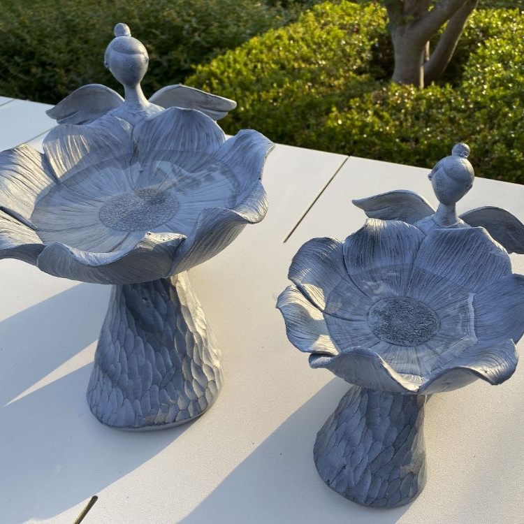 Disse detaljerede fuglebade forener det praktiske med det æstetiske og fungerer som små haveskulpturer i sig selv. Udformet som en yndig engel, der nænsomt præsenterer en blomstret skål fyldt med vand, skaber de et naturligt samlingspunkt for havens fugle. Den antikgrå finish giver et tidløst udtryk, der klæder både den romantiske terrasse og den vildere have. Placer dem i et blomsterbed eller ved indgangen for at tilføre en rolig og charmerende atmosfære til dit uderum.