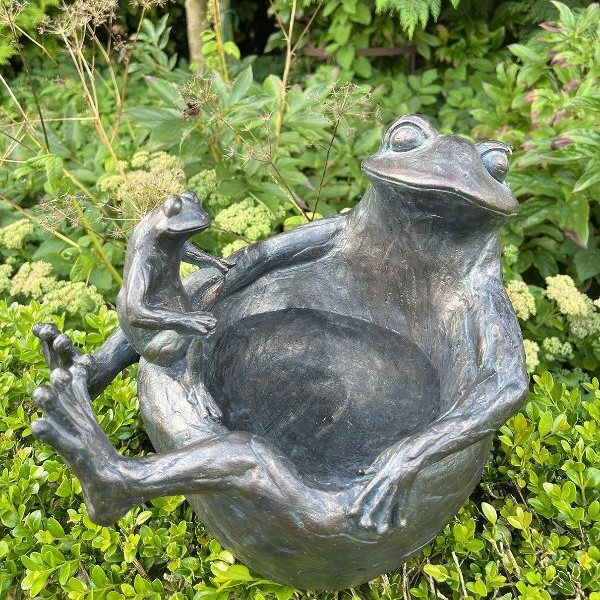 Giv havens fugle et charmerende samlingspunkt med dette unikke fuglebad, formet som to legesyge frøer. Fuglebadet er udført med mange fine detaljer, hvor en stor frø udgør selve badet, mens en mindre frø sidder på kanten og kigger med. Det giver et livligt og eventyrligt udtryk til ethvert udemiljø.