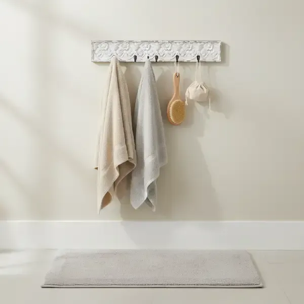 • På badeværelset: Den lyse creme-farve er ideel til at skabe en rolig spa-stemning, hvor knagerækken kan holde dine håndklæder, badekåber eller vaske-tilbehør (som vist i inspirationsbilledet med de bløde tekstiler).