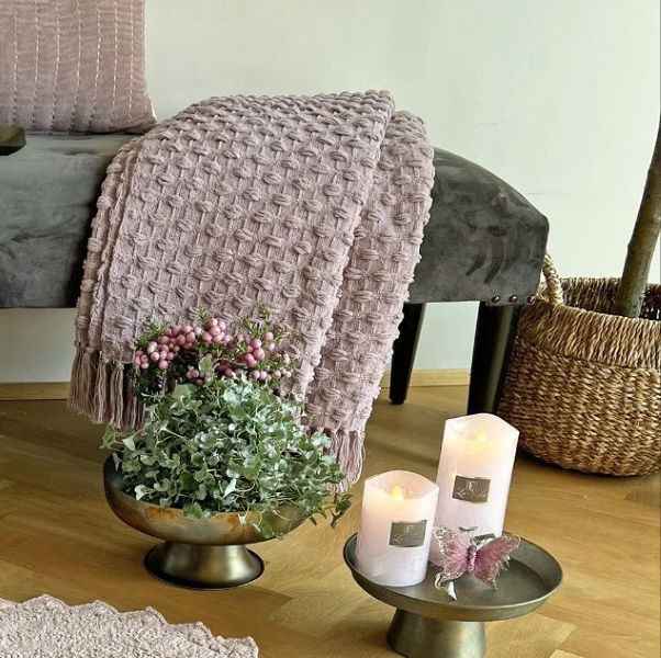 Skab en varm og indbydende atmosfære i dit hjem med denne delikate, vævede plaid i en smuk gammelrosa nuance. Plaiden er kendetegnet ved sit unikke reliefmønster, hvor små, præcise "knopper" træder frem og skaber en blød og levende overflade. Dette giver tekstilet en dybde, der inviterer til berøring og hygge. Fremstillet i en slidstærk blanding af bomuld og polyester, forener plaiden bomuldens naturlige komfort med polyesterens praktiske holdbarhed, så den holder sig flot over tid.