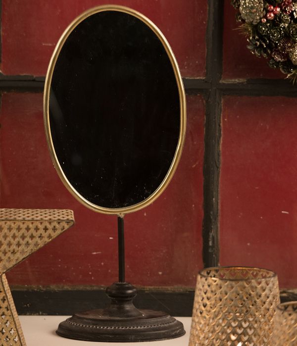 Tilføj et strejf af klassisk elegance til dit hjem med dette smukke ovale spejl på fod. Spejlet er indrammet af en fin guldkant, der giver et eksklusivt look og fanger lyset i rummet. Den slanke, sorte fod skaber en flot kontrast til guldet og sikrer, at spejlet står stabilt på både kommoden, natbordet eller badeværelseshylden.