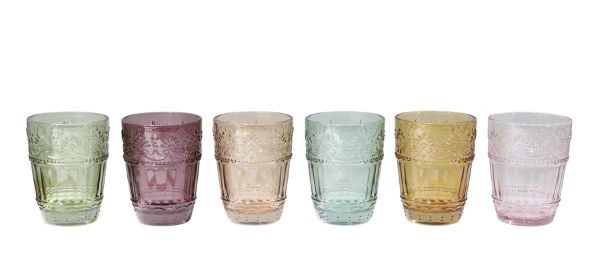 Giv din borddækning et strejf af boheme og retro-elegance med disse unikke drikkeglas fra La Vida. Glassene skiller sig ud med deres smukke, prægede mønstre og fås i seks forskellige, varme farver, der komplementerer hinanden perfekt. Uanset om du dækker op til en hyggelig hverdagsmiddag eller en stor havefest, skaber de farvede glas en personlig og levende atmosfære. De er robuste nok til daglig brug og tåler opvaskemaskine, hvilket gør dem både smukke og praktiske. Miks farverne for et legende udtryk, eller vælg din favorit til at skabe en rød tråd i din borddækning.