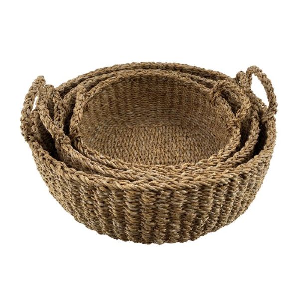 Søgræs er et naturligt materiale, der ikke kun ser smukt ud, men også er meget stærkt og smudsafvisende, hvilket gør disse kurve ideelle til både indendørs og udendørs brug. Hver kurv er flettet med praktiske håndtag, så de er nemme at flytte rundt på. Brug dem som brændekurv, til legetøj, tæpper eller som en pyntekurv fyldt med puder. Sættet indeholder tre forskellige størrelser, der passer til ethvert behov og kan stables i hinanden, når de ikke er i brug.