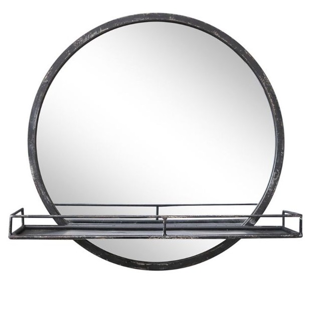 Dette elegante runde spejl kombinerer funktionalitet og tidløs charme på smukkeste vis. Spejlet er indrammet i jern med en flot finish i antik kul, der har en naturlig patina, som giver karakter til væggen. Den integrerede hylde gør spejlet ideelt til praktisk opbevaring eller til at udstille små dekorative genstande.