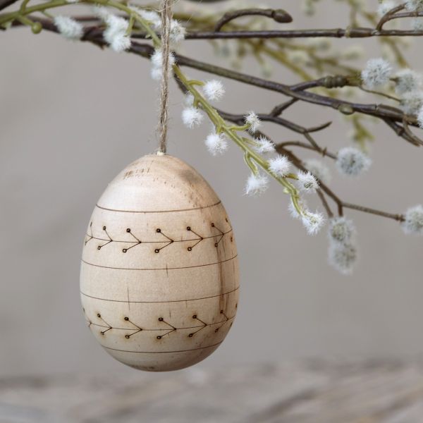 Da ægget er lavet af naturligt træ, har hvert eksemplar sin egen unikke struktur og glød. Det er monteret med en enkel jutesnor, så det er lige til at hænge på forårsgrene i en vase eller bruge som en del af en hyggelig borddækning. Det naturlige materialevalg gør det nemt at kombinere med både farverige påskeæg og andre dekorationer i naturmaterialer.
