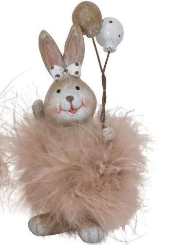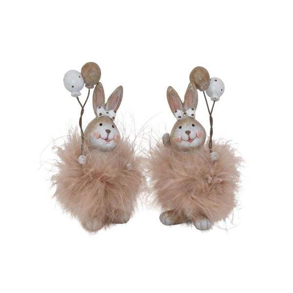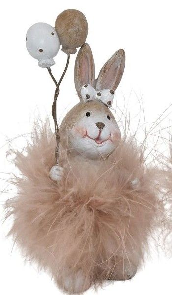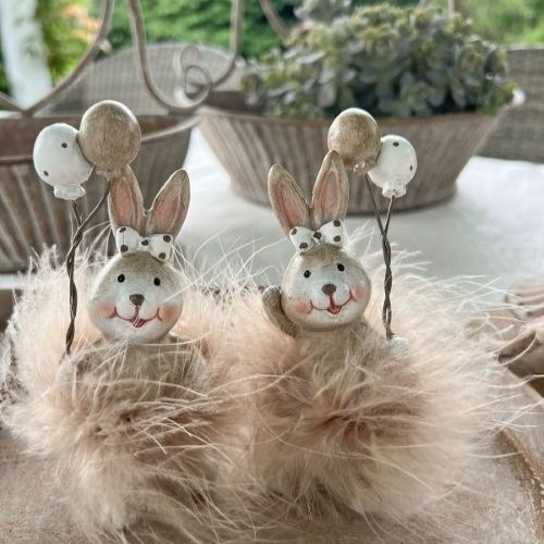 Skab en legende og hjertevarm atmosfære med dette yndige sæt af to påskeharer, der hver bærer et par festlige balloner. Harerne er detaljerigt udført med små prikkede sløjfer og et venligt smil, der med det samme spreder glæde. De er omkranset af en blød og luftig pelskrave i en sart puddernuance, som giver figurerne et let og drømmende udtryk.