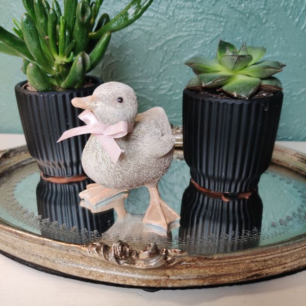 Ællingen er oplagt at bruge som et muntert indslag midt i en borddækning eller placeret under en glasklokke sammen med tørrede blomster og små vagtelæg. Dens kompakte størrelse og robuste materiale gør det nemt at integrere den i dine egne kreative opsætninger, hvor den tilføjer personlighed og et smil på læben hos dem, der ser den.