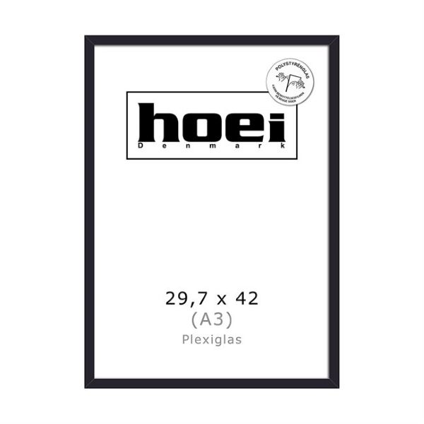Skab en elegant og moderne ramme om din kunst med denne sorte træramme fra Hoei Denmark. Rammen er udstyret med brudsikkert plexiglas (polystyrenglas), hvilket gør den både lettere og mere sikker end traditionelle glasrammer. Dette gør den særligt velegnet til børneværelser eller steder, hvor vægten af ophænget skal minimeres. Den dybe sorte farve og den slanke profil giver et stilrent, skandinavisk udtryk, der lader dine A3-plakater og billeder træde tydeligt frem.