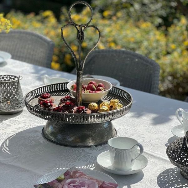 Gør din boligindredning mere eksklusiv med denne smukke opsats i antik sølv. Opsatsen er designet til at hæve dine dekorationer fra bordet, hvilket giver et elegant og luftigt udtryk, uanset om du bruger den til bloklys, blomster eller årstidens pynt. Den rustikke sølvfinish med de fine detaljer langs kanten giver et klassisk look, der passer perfekt ind i både den franske landstil og en moderne indretning.